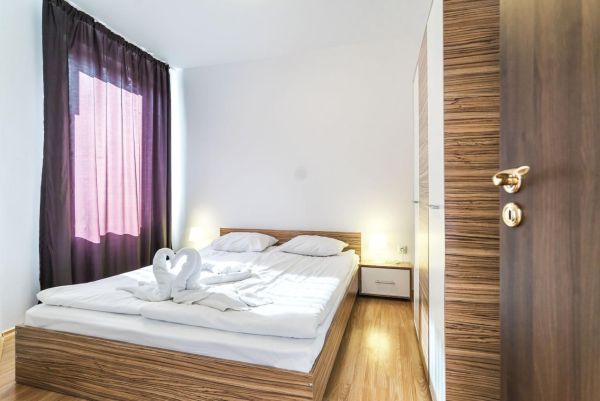 1 hálószobás apartman – (max. 2+2/3+0), kertre néző, hálószoba franciaággyal, nappali kihúzható kanapéval, konyhasarok asztallal és 4 székkel, konyhai felszerelés