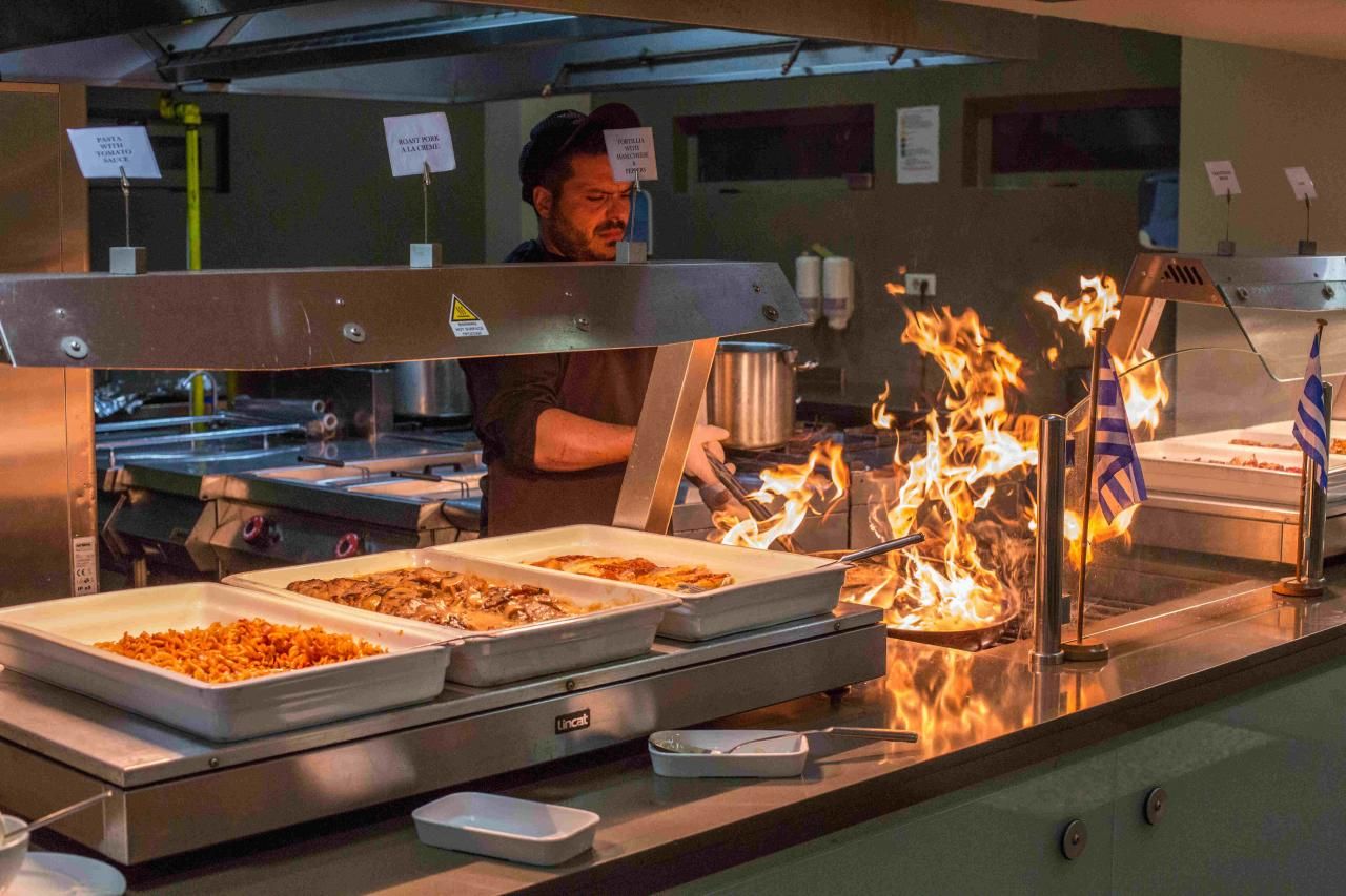 Ultra all inclusive ellátással foglalható, mely tartalmazza a reggelit, ebédet, vacsorát, valamint a helyi alkoholos- és alkoholmentes italokat. Napközben snackételeket, desszertet, gyümölcsöt kínálnak. Tematikus éttermeiben (görög tengergyümölcsei, ázsiai ételek és sushi, tradicionális görög konyha, olasz fogások) előzetes foglalást követően lehet vacsorázni. A szálloda nyolc étteremmel és öt bárral rendelkezik.