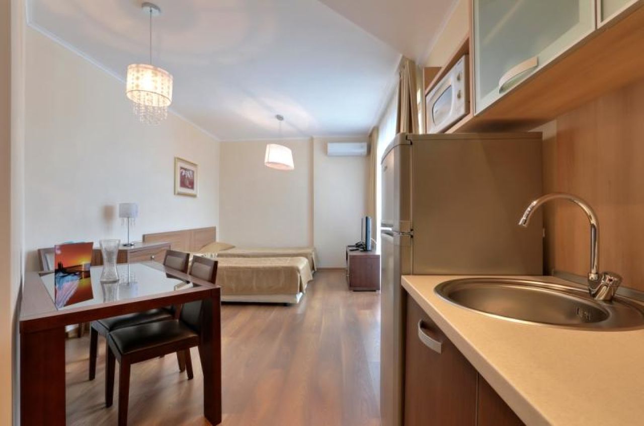 Stúdió kb. 35 m² (min. 2 felnőtt; max. 2+1/3 felnőtt) – kétágyas vagy franciaágy és összecsukható/kanapéágy. A stúdiók szobáinak felszereltsége – fürdőkád, hajszárító, erkély, légkondicionáló, telefon, LCD TV, vezeték nélküli internet, széf (ingyenes), vízforraló, konyhasarok edényekkel és evőeszközökkel, hűtőszekrény.