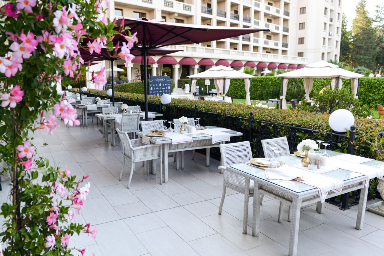 Az étterem 150 férőhelyes és 80 férőhelyes teraszáról hihetetlen kilátás nyílik a szálloda kertjére, a tengerre és a medencére.