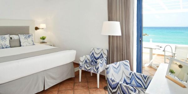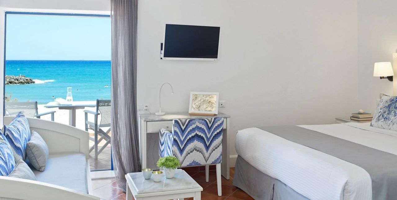 Bungalow Superior Water Front: kb. 25-29 m2 alapterületű, a tengerparton az első sorban elhelyezkedő szoba. Kihúzható pótággyal, hifi berendezéssel, valamint napernyővel és napágyakkal felszerelt erkéllyel rendelkezik. Érkezéskor díjmentesen krétai süteményeket, szezonális gyümölcsöket, helyi üdítőket, sört és ásványvizet készítenek be a szobába.
