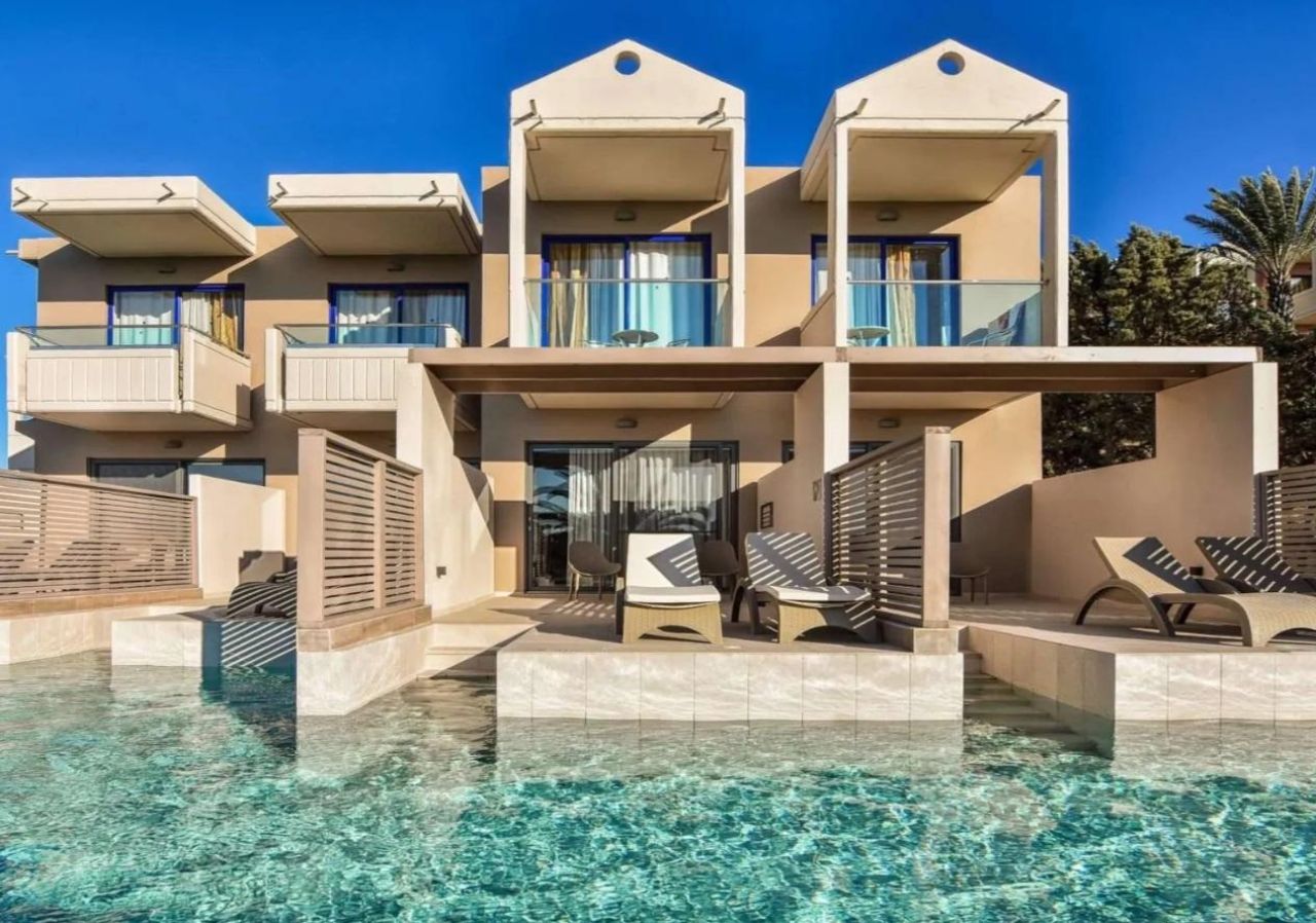 Double Deluxe Swim Up: frissen felújított, 25 m2 alapterületű szobák franciaággyal, ingyenes WIFI-vel és széffel, közvetlen medencekapcsolattal, és kertre vagy tengerre néző kilátással.