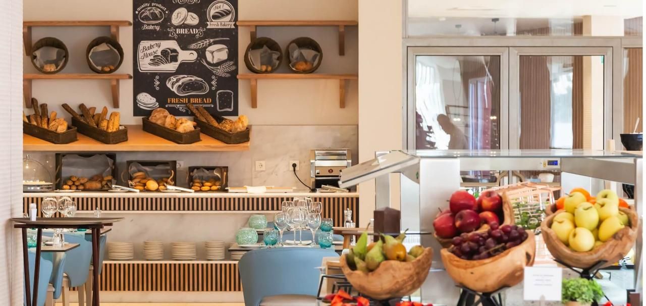 Az étterem nagy terasszal rendelkezik, és a szállás ára tartalmazza a reggelit vagy a félpanziót, amelyet büfé formájában, show cookinggal szolgálnak fel. Az à la carte étterembe előzetes foglalás szükséges, emellett van egy medencebár/snackbár is.
