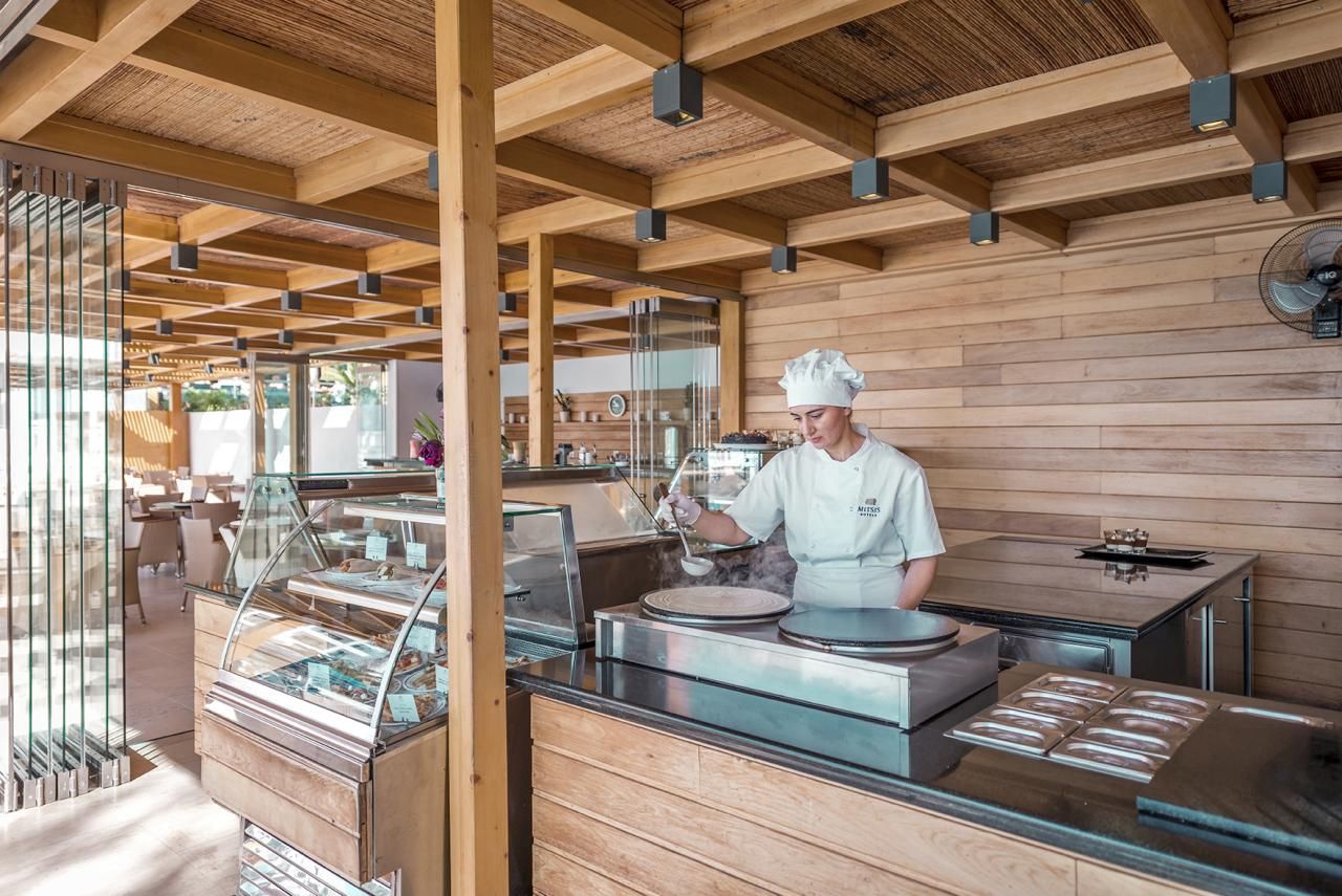 Ultra all inclusive ellátással foglalható, mely tartalmazza a reggelit, ebédet, vacsorát, éjszakai büfét, valamint a helyi alkoholos- és alkoholmentes italokat és a reggelihez felszolgált frissen facsart narancslevet és kávét. A szálloda hat a’la carte étteremmel rendelkezik (tradicionális görög előételek [meze], olasz konyha, mexikói ízek, ázsiai fogások, hamburger/gyros, sushi), melyekben előzetes foglalást követően lehet ebédelni és/vagy vacsorázni. Napközben snackételeket, salátát, süteményeket, fagylaltot, édes és sós palacsintát, teát, vattacukrot, pattogatott kukoricát és a bárokban jégkását kínálnak. A hotel három bárral is rendelkezik. Térítés ellenében és a szabad kapacitás függvényében gyertyafényes vacsora is fogyasztható a kertben.