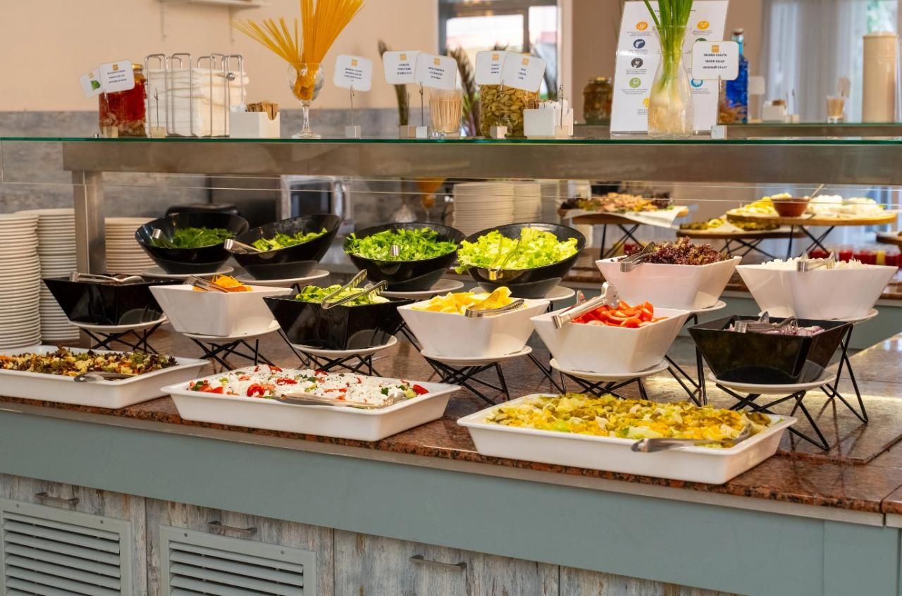 Büfé széles választékkal: friss gyümölcsök és zöldségek, péksütemények, meleg italok, üdítők, víz, frissítő gyümölcslevek.