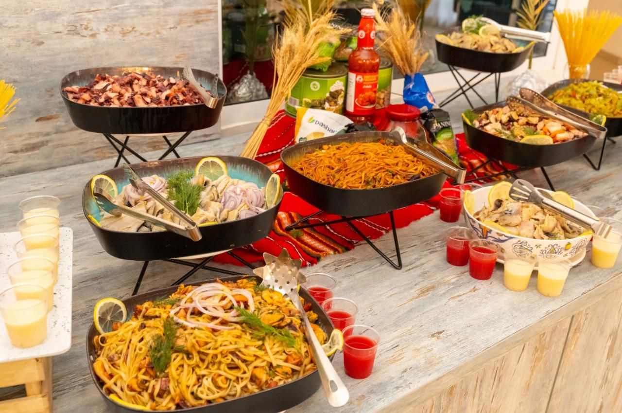 Büfé salátákkal, levesekkel, előételekkel, főételekkel, desszertekkel, gyümölcsökkel, valamint vízzel, gyümölcslevekkel, üdítőkkel, csapolt sörrel, borral, helyi és import alkoholos italokkal.