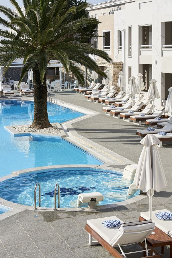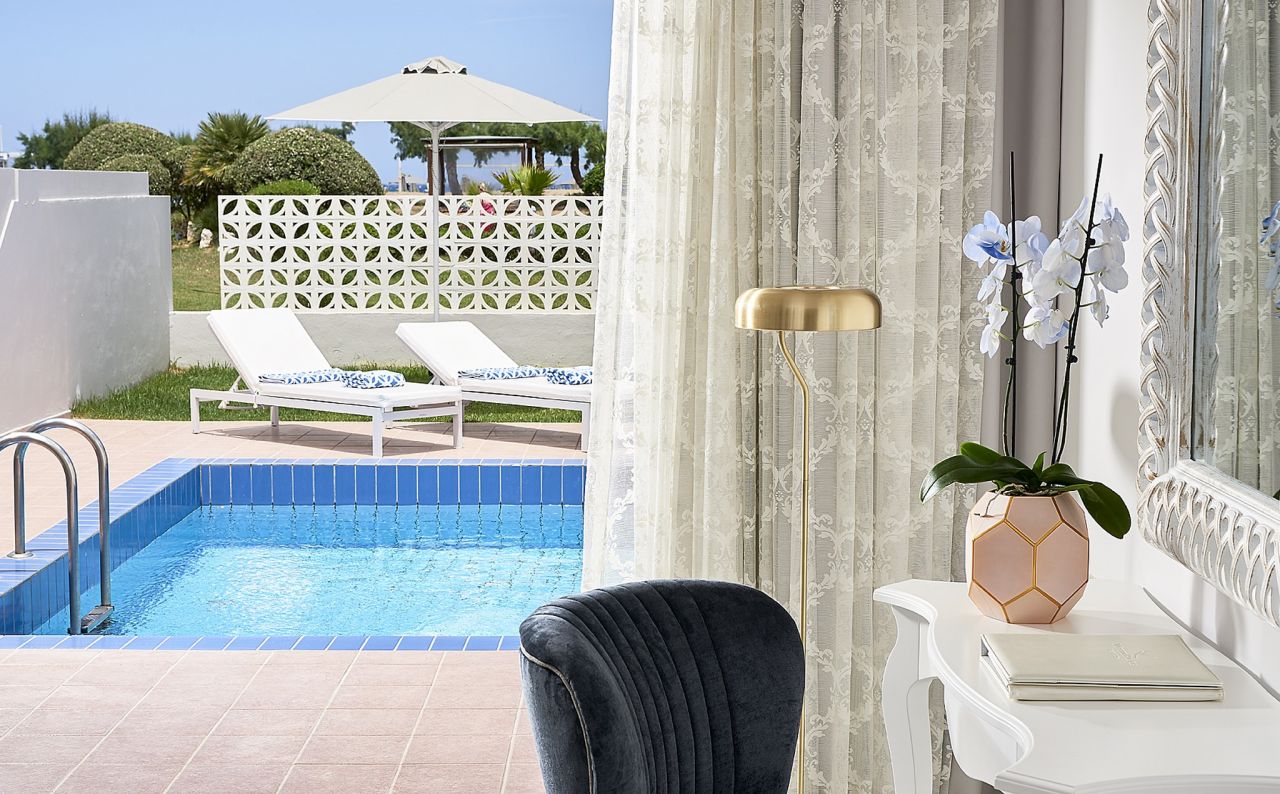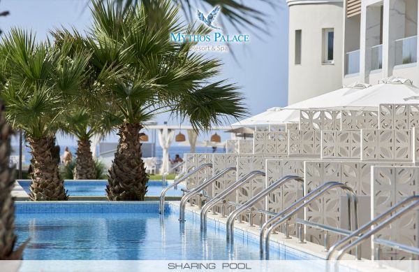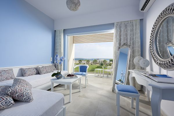 Mythos Swim Up junior Suite Beach Front: Maximum 4 fő elhelyezésére alkalmas. Medencével és közvetlen, akadálytalan kilátással rendelkezik a tengerre. Egy hálószobából és egy nappaliból áll.
