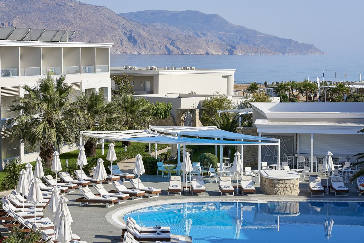 Az 5*-os Mythos Palace Resort & Spa közvetlenül a Kék Zászló-díjas, aranyszínű homokos tengerparton található, ahol privát partszakasszal rendelkezik. A hotel Chania repülőterétől kb.51 km-re, Rethymno belvárosától kb. 20 km-re, Georgioupoli központjától pedig kb. 6 km-re fekszik.