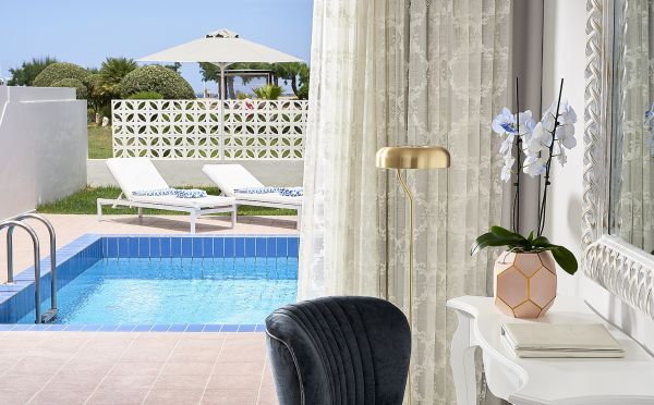 Mythos Villa Beach Front Private Pool: Maximum 4 fő számára foglalható. A legkiválóbb felszereltséggel, közvetlen kilátással a tengerre és saját medencével rendelkeznek. Minden villa tágas hálószobával, nappalival, márvány fürdőszobával és külön zuhanyzóval rendelkezik.