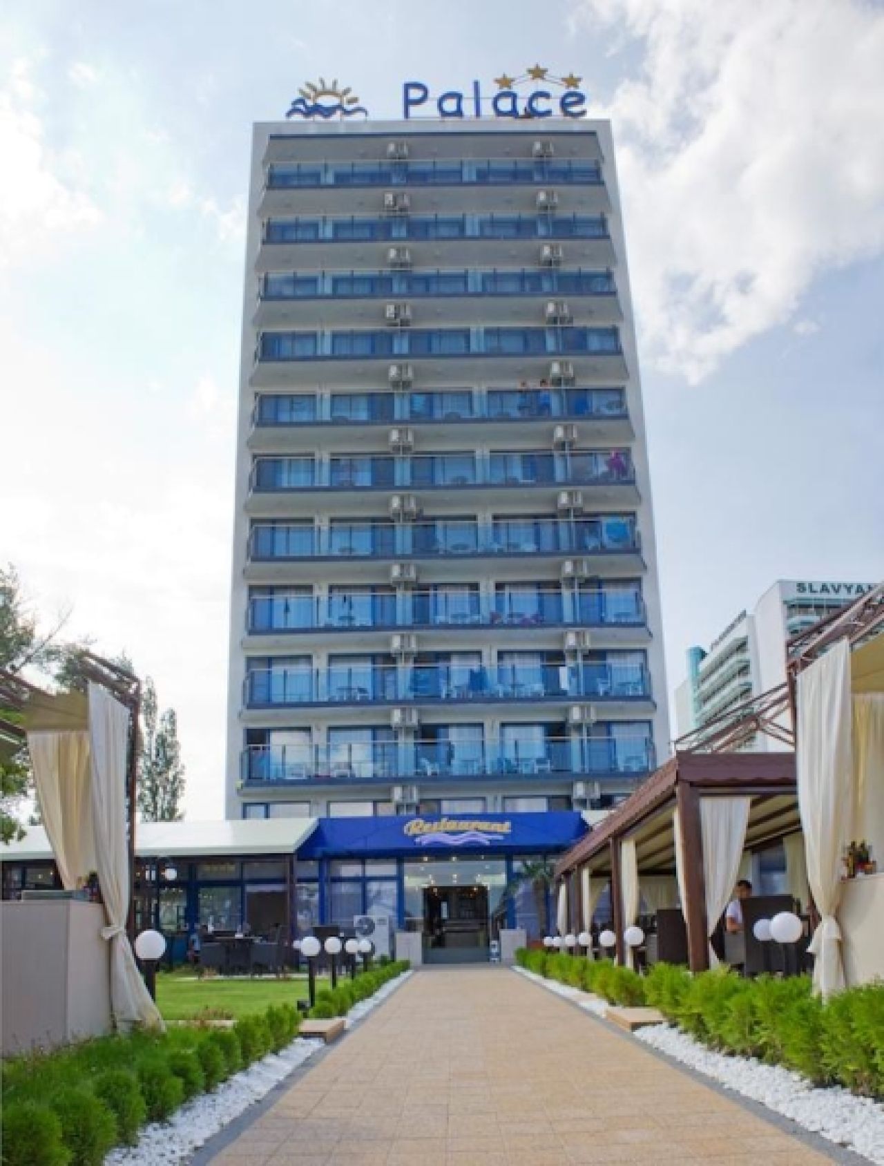 A Palace Hotel Napospart északi részén található, közvetlenül a homokos tengerparton fekszik. Az üdülőhely központja körülbelül 1,5 km-re, a burgaszi repülőtér pedig kb. 30 km-re található. A szállodából fantasztikus kilátás nyílik a tengerre, és számos üzlet, étterem és látnivaló veszi körül.