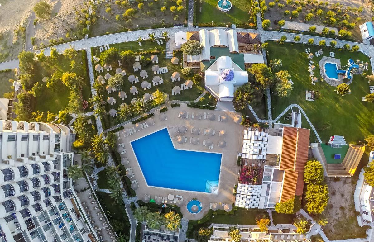 A szálloda Faliraki üdülőben, közvetlenül a homokos tengerparton fekszik. Rodosz város kb. 13 km-re, a repülőtér pedig kb. 20 km-re található.