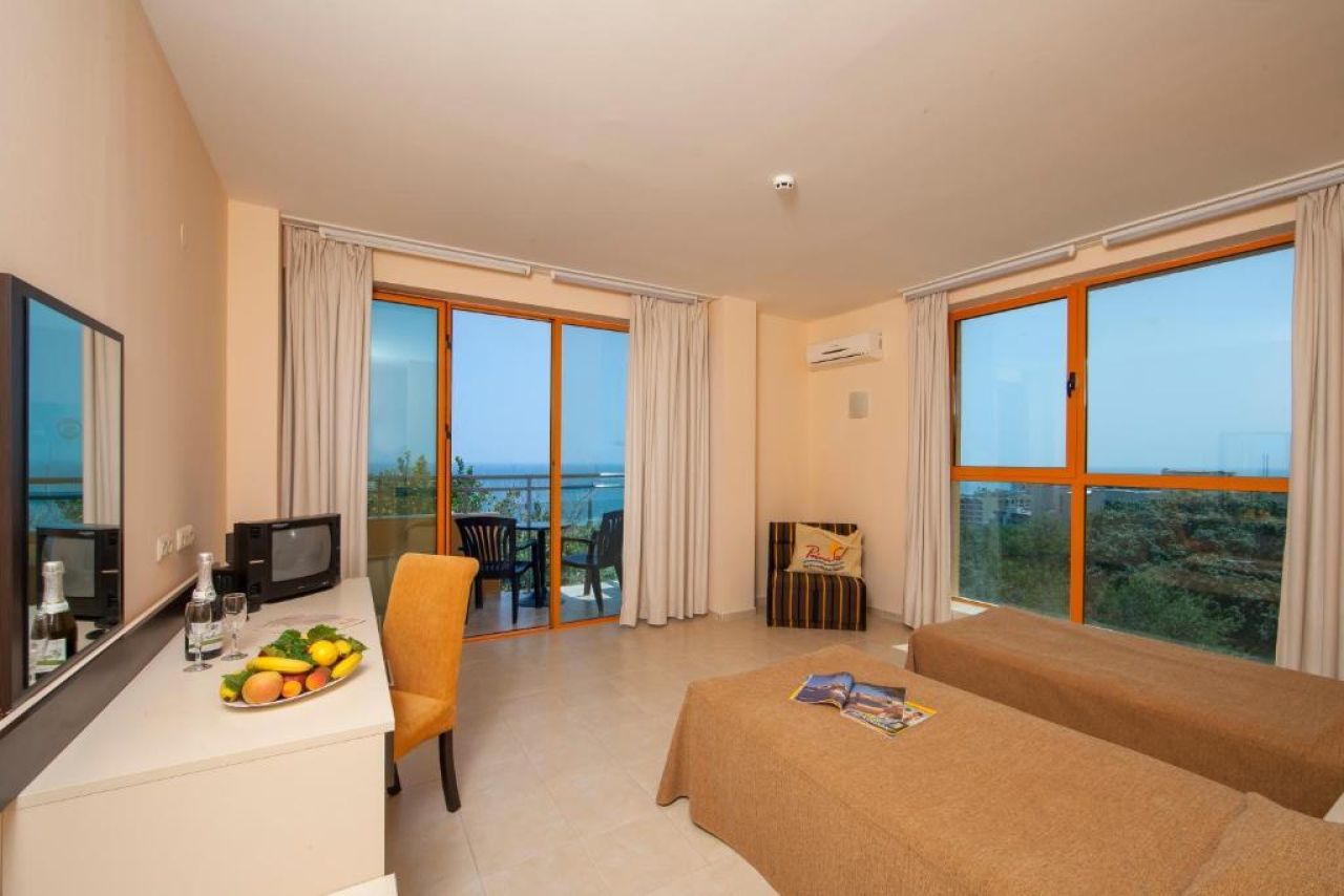 Kétágyas szoba (park vagy tengerre néző) – kb. 23 m² (min.1+1 / max. 2+1 / 3+0), 2018/19 télen felújított, kényelmes bútorozás, 2 külön ágy és 1 pótágy/kanapé, légkondicionáló, SAT LED TV, minibár, telefon, zuhanyzós fürdőszoba, hajszárító, erkély