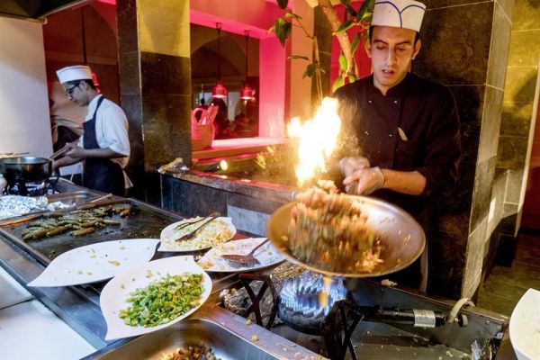 All inclusive ellátással foglalható, mely tartalmazza a reggelit a késői reggelivel együtt, ebédet, vacsorát, éjszakai büfét, a helyi alkoholos- és alkoholmentes italokat, pezsgőt, török kávét, tradicionális tunéziai teát, valamint a vízipipát. Napközben snackételeket kínálnak. A szállodában található tunéziai, olasz és ázsiai a'la carte étterem, melyekben a vendégek előzetes foglalást követően díjmentesen vacsorázhatnak. A hotel több bárral és egy mór kávézóval is rendelkezik. A palackozott víz, a helyi alkoholos- és alkoholmentes italok 24/24 elérhetőek.